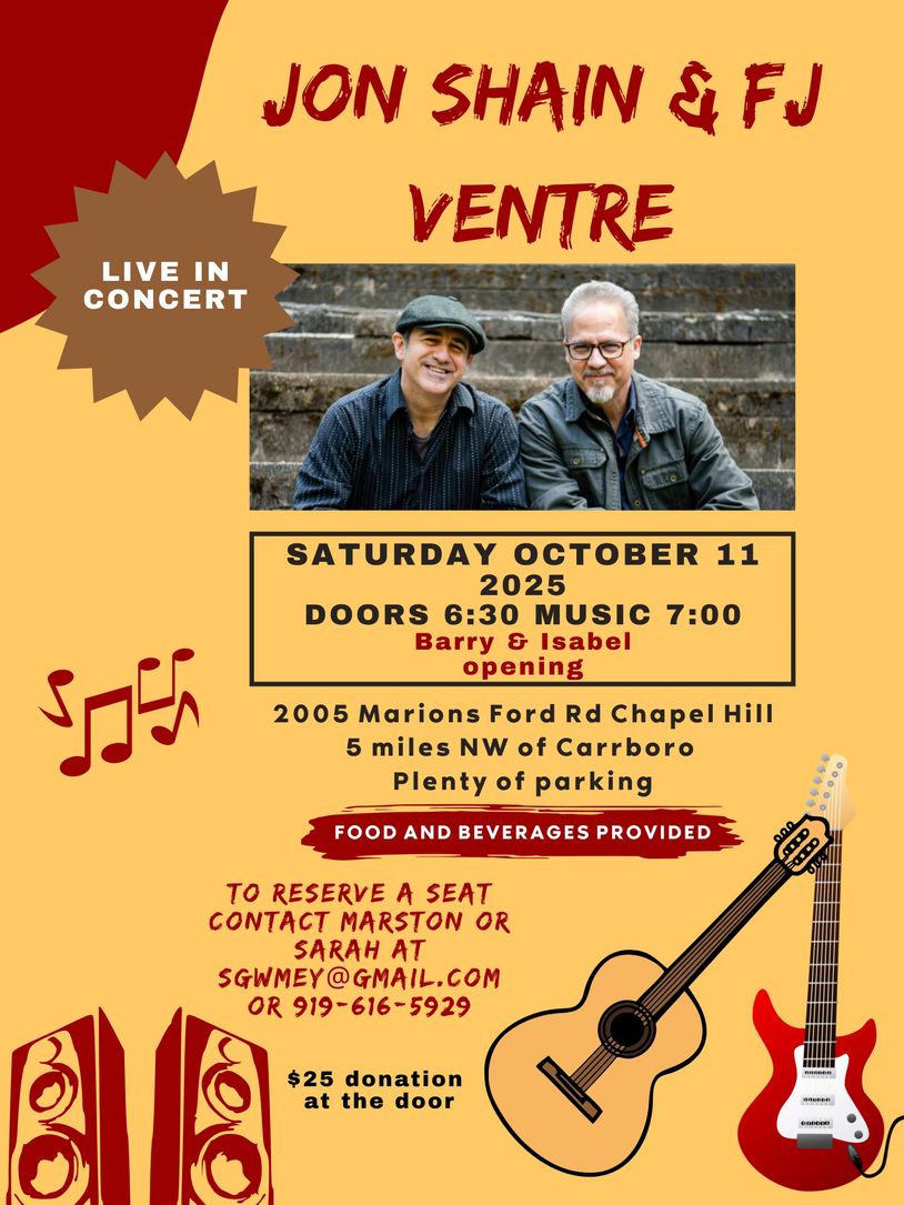 We're excited to open for our friends Jon Shain and FJ Ventre at a house concert on Sat. Oct. 11. Seating is limited. Contact sgwmey@gmail.com to reserve a seat!